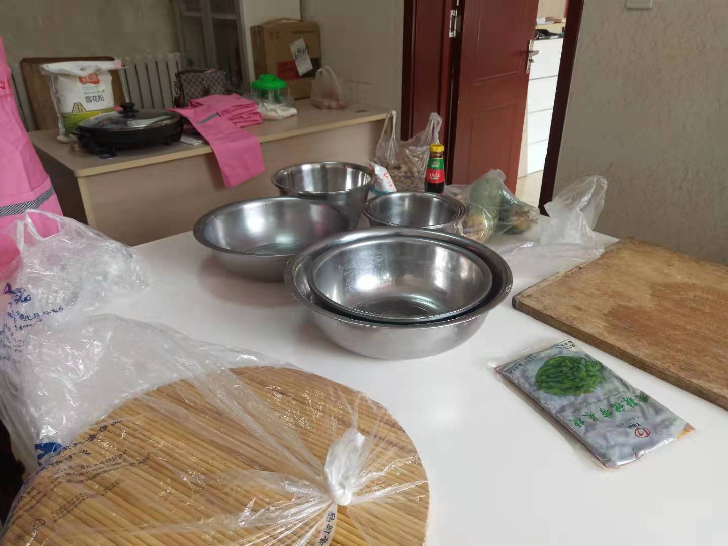從前天開(kāi)始領(lǐng)導(dǎo)和大姐們就開(kāi)始準(zhǔn)備了,今天一到公司就看到廚房里堆了一袋面粉、一袋雞蛋,還有面板、面盆、搟面杖等用具,一會(huì)大姐們還陸陸續(xù)續(xù)的帶來(lái)了韭菜、蕓豆、胡蘿卜、青蘿卜、芹菜,土豪的周經(jīng)理還送來(lái)了豬肉、大蝦。